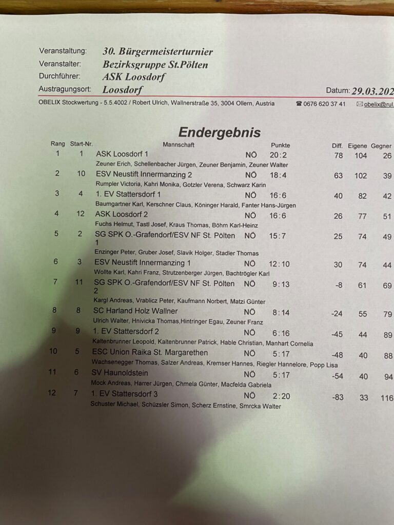 Am Karsamstag war eine Mannschaft beim Pokalturnier in Innermanzing im Einsatz. Die Schützen Marchat Christopher, Bandion Manfred, Enzinger Peter und Kargl Andreas erreichten den sehr guten 3. Tabellenplatz. Gratulation.